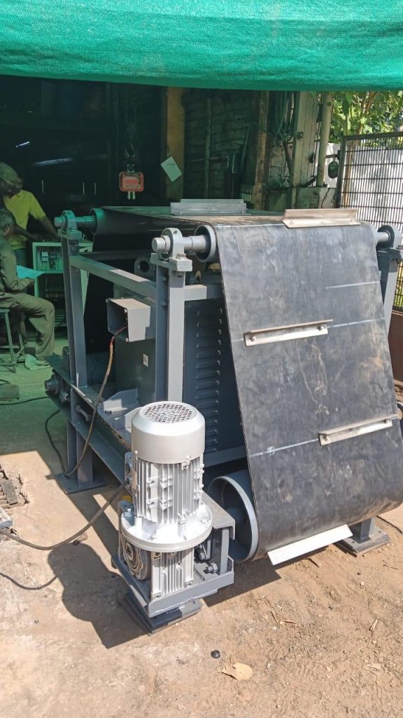 - Cleated Belt – Moves the attracted ferrous material from nonmagnetic materials, which is moved by a separator belt to a collection bin or chute.